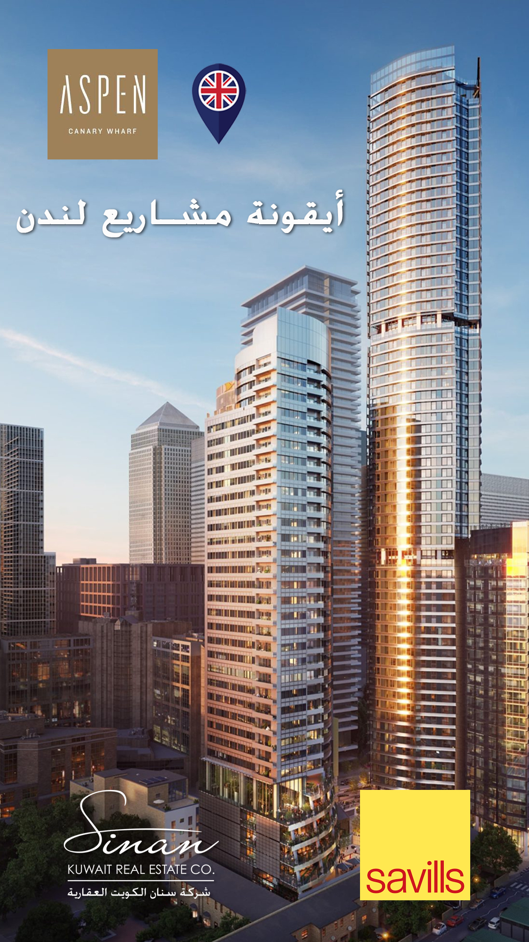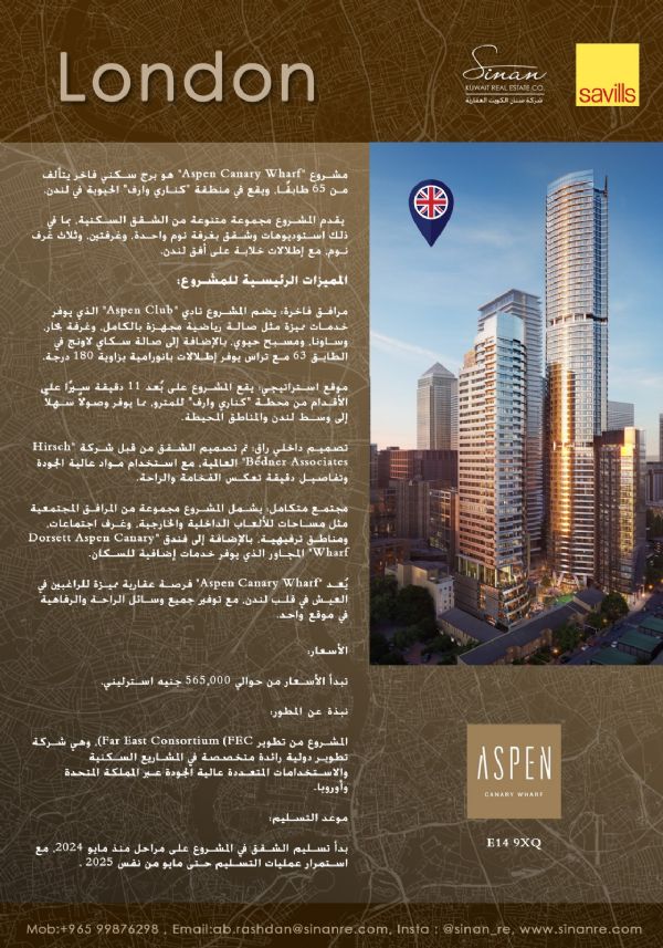 The Pinnacle of Luxury in the Heart of Canary Wharf. Experience a lifestyle of absolute luxury at "Aspen," the iconic 63-story residential tower situated in the heart of Canary Wharf, London, offering a strategic and vibrant location. The project features 502 luxury apartments, ranging from studios to one-, two-, and three-bedroom units, all designed to the highest quality standards and offering breathtaking panoramic views of the London skyline. Investment in this prestigious address starts from approximately £539,500, with areas ranging from 452 to 1,100 per square foot. The location ensures excellent accessibility, given its proximity to primary transport links, including the Jubilee Line and the Elizabeth Line.